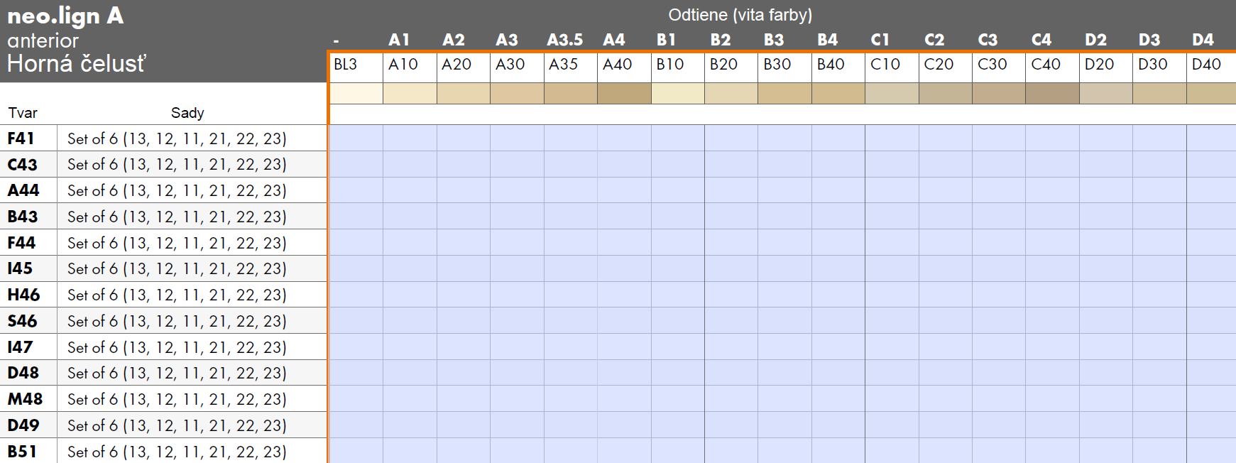 T (zuby) ...O (horné) .....F41 (tvar/veľkosť zubov) .... A10 (farba VITA / A1) .... S (set)