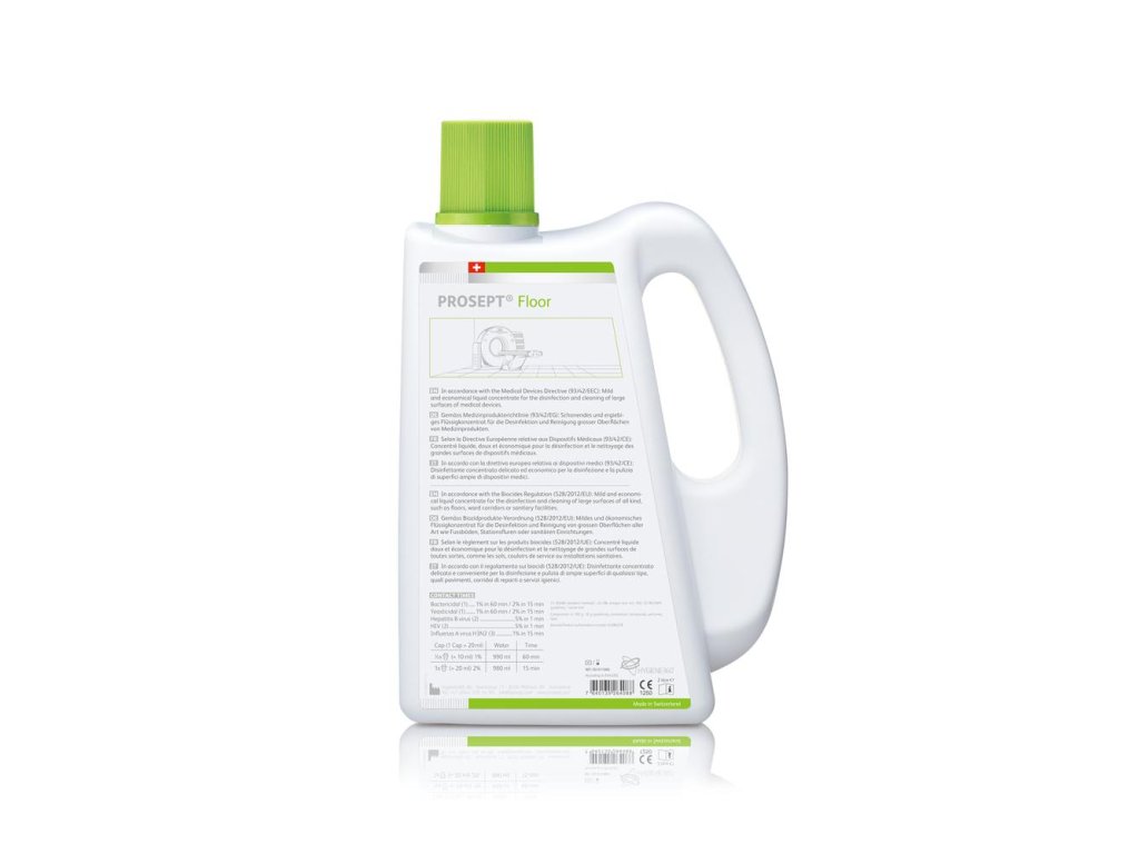 PROSEPT® Floor je koncentrát pre dezinfekciu veľkých umývateľných plôch. Dezinfekčný prostriedok je založený na kombinácii účinných látok na bázi kvartérnych amóniových zlúčenín, ich dôsledkom je vysoká čistiaca účinnosť a široké spektrum účinnosti. Koncentrát PROSEPT® Floor nemá žiadne lepivé účinky nie je nutné ho dodatočne utierať vďaka skoro bezozbytkovému vyschnutiu. Tento produkt neobsahuje žiadne aldehydy a fenoly. Viečko s dávkovacou značkou na 20 ml, ktorá je pre špeciálne vyvinuté koncentráty, uľahčuje manipuláciu a umožňuje vysokú presnosť dávkovania pre praktickú a zároveň i ekonomickú a ekologickú aplikáciu. Efektívne riešenie pre účinnú dezinfekciu neinvazívneho zdravotníckeho vybavenia.